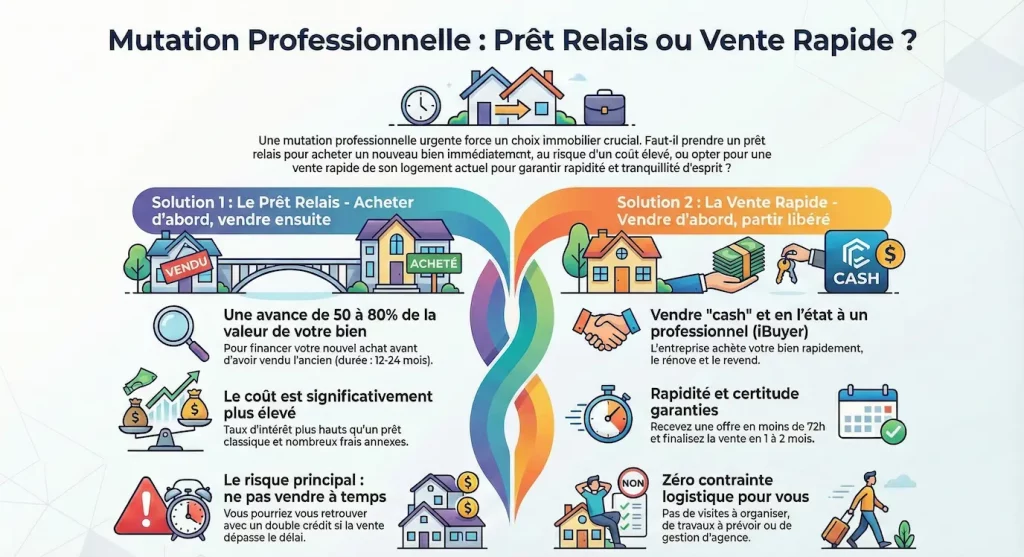 Si vous devez prendre votre poste dans moins de 6 semaines, il est trop tard pour un prêt relais (instruction du dossier bancaire + recherche de nouveau logement = minimum 4 à 6 semaines). La vente express ou la location temporaire de votre bien deviennent vos seules options.